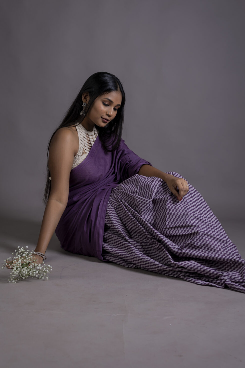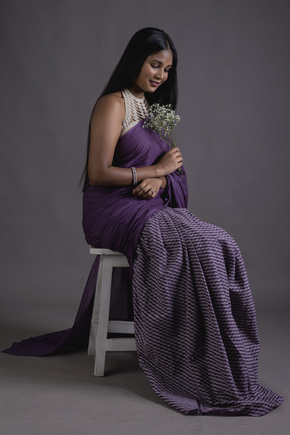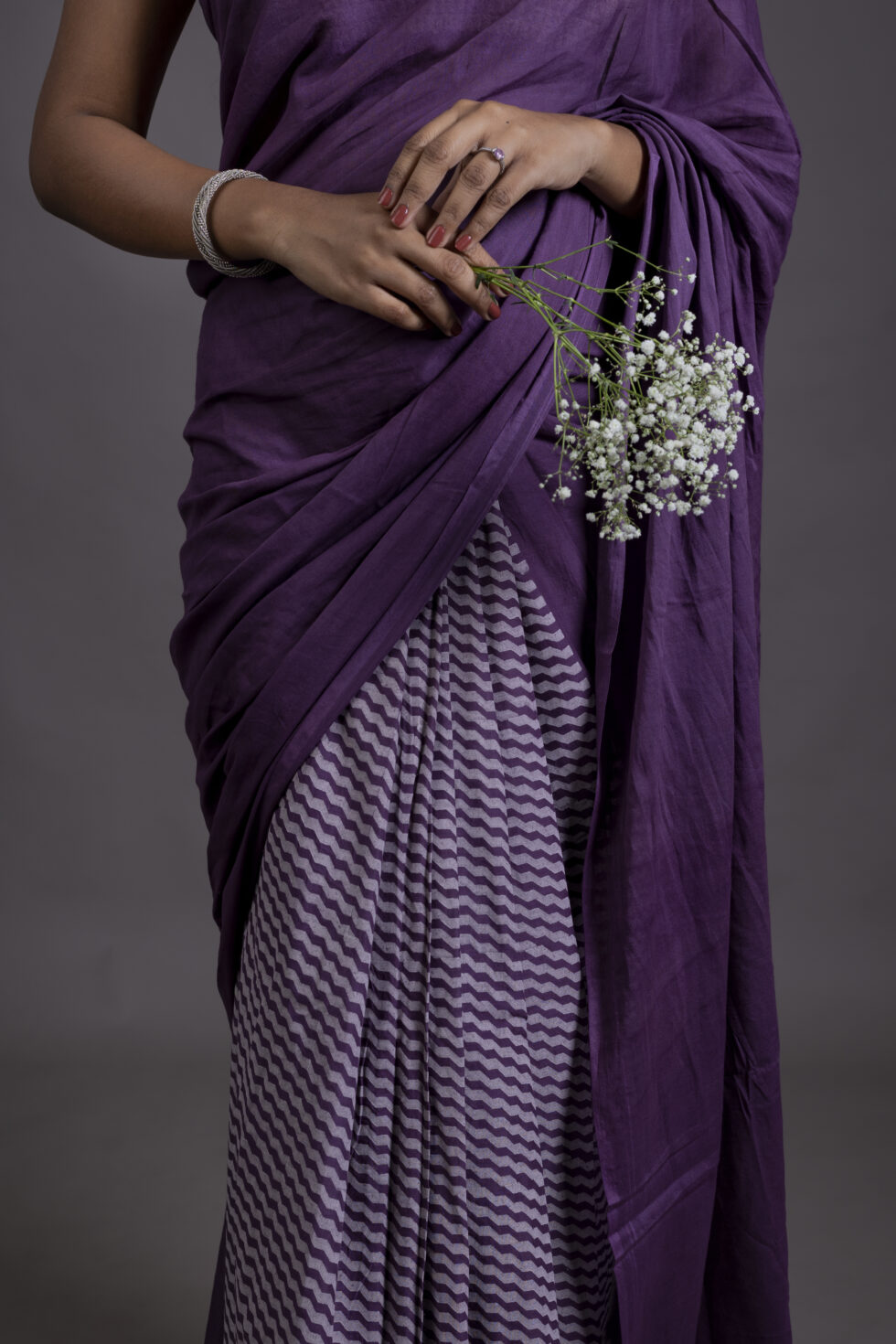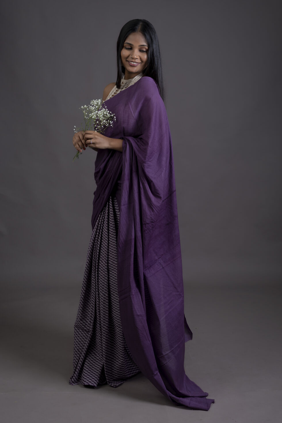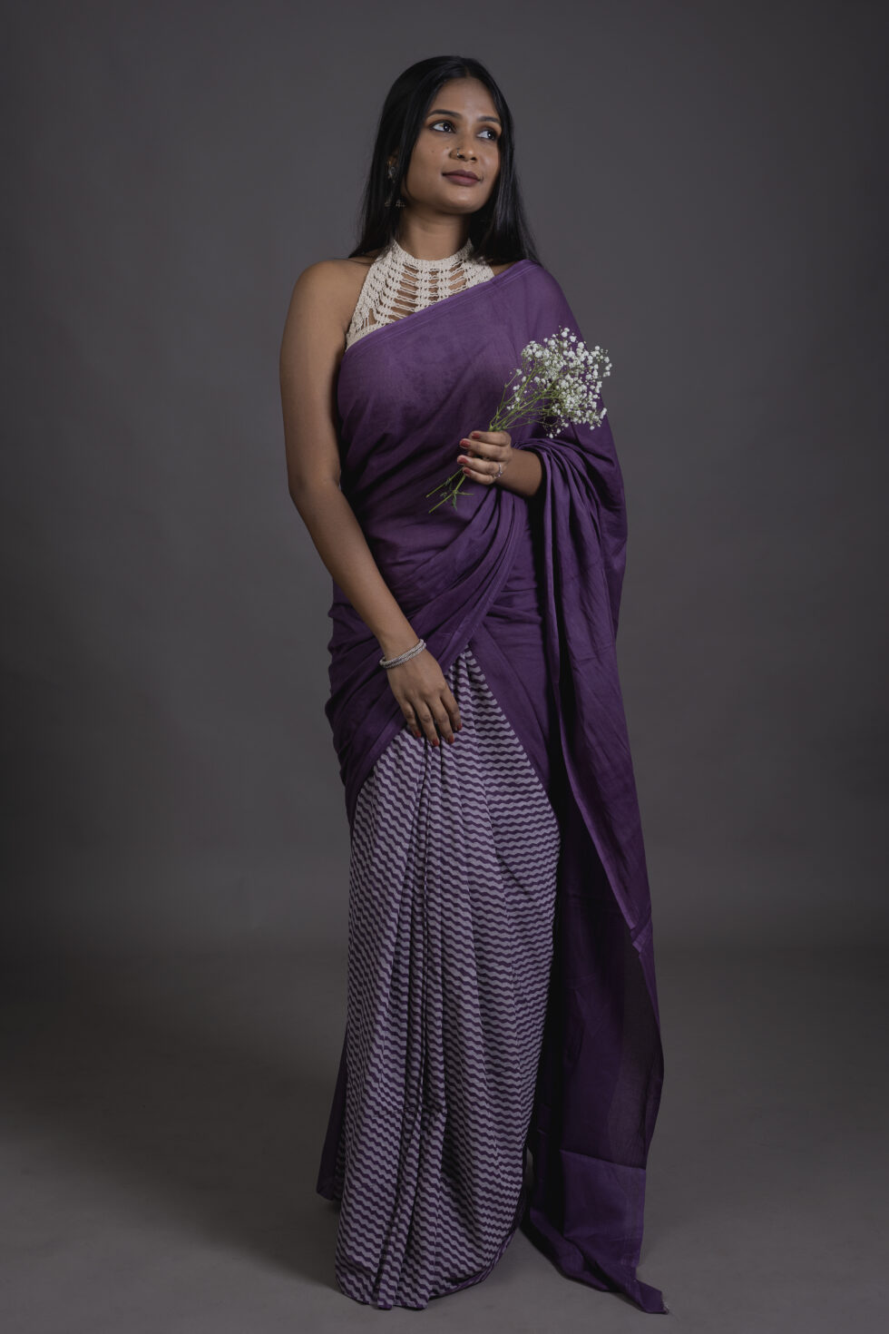 This lilac saree reminds you of soft twilight skies, where everything feels still and serene. With its gentle handblock prints and delicate purple shade, it carries an air of tranquility that wraps you in elegance. The breathable mulmul cotton ensures you stay comfortable and at ease, making this saree a perfect choice for those moments when you want to feel both relaxed and radiant.